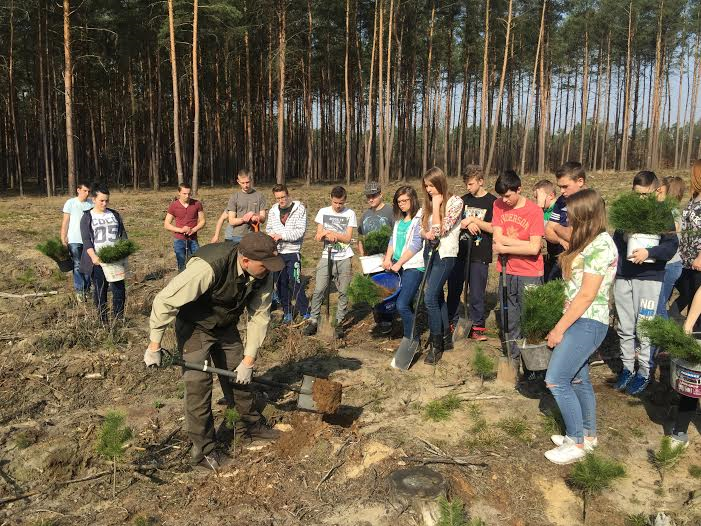 z Nadleśnictwem Sarbia. Młodzież sadziła drzewa na terenie Leśnictwa Gębice. Akcją kierował leśniczy Pan Marcin Filoda. Przed rozpoczęciem pracy pan leśniczy wyjaśnił młodzieży, jak należy prawidłowo wyznaczać odległości pomiędzy młodymi drzewkami oraz zdradził tajniki skutecznego sadzenia. Po szkoleniu uczniowie zabrali się do wykonania zadania. Piękna, słoneczna pogoda dodała skrzydeł, a na twarzach gościł malowniczy uśmiech. Z przyjemnością wrócimy tam po latach, żeby zobaczyć jak urosły posadzone przez nas drzewa.