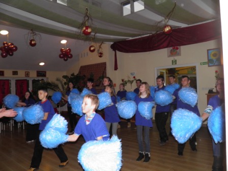 Kolejna grupa uczniów, wspólnie z uczestnikami warsztatów brała udział w zajęciach ruchowo – muzycznych pod kierunkiem rehabilitantki p. Pauliny Wojciechowskiej i uczyła się kroków do układu tanecznego. Wspólny taniec został przedstawiony w trakcie imprezy integracyjnej podsumowującej działania projektowe.